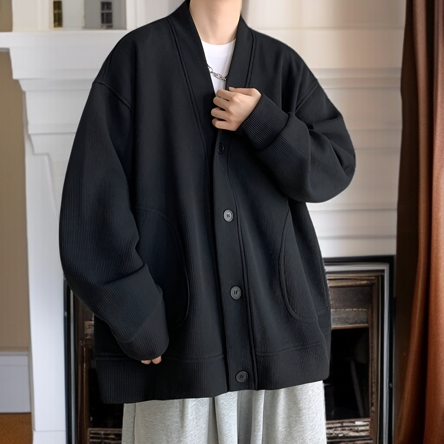 春と秋に着用する男性用のレイジースタイルのウールカーディガンジャケット、Vネックのアメリカンジャケットを備えた先進的な若々しいフードなしセーター